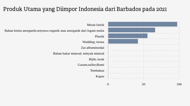 Dari total 97 produk (kode HS dua digit) yang diimpor dari Barbados, 0,04 ribu produk bernilai lebih dari satu miliar dolar. Kebanyakan produk impor dari tempat ini, merupakan impor produk yang juga banyak diimpor dari negara lain yang jumlahnya tercatat ada empat produk.