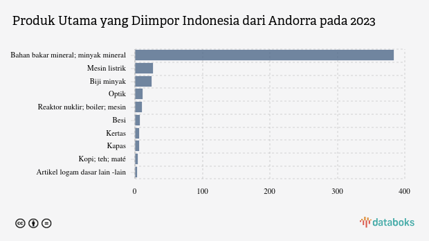 Dari total 97 produk (kode HS dua digit) yang diimpor dari Andorra, 39 produk bernilai lebih dari satu miliar dolar. Selain itu menurut data Trademap, dari negara ini terdapat 11 produk utama Indonesia yang diimpor setiap tahun. Artinya, ada ketergantungan cukup besar untuk produk-produk impor tersebut. Lainnya, sebagian besar produk merupakan impor produk yang juga banyak diimpor dari negara lain.