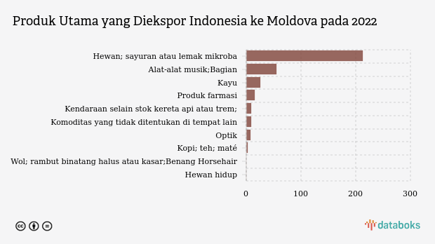 Di urutan kedua, ekspor Indonesia paling banyak adalah produk Alat-alat musik. Nilai ekspor dari Moldova pada 2022 tercatat US$ 55 ribu. Pada tahun sebelumnya Indonesia tidak mencatat adanya ekspor ke negara ini.
