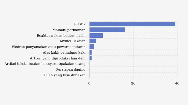 Plastik dan artikelnya dengan kode HS 39. Impor produk ini dari Armenia berada di urutan pertama. Indonesia mengimpor senilai US$ 39 ribu. Nilai impor Plastik dan artikelnya ini naik dibandingkan periode sebelumnya yang tercatat US$ 1 ribu.