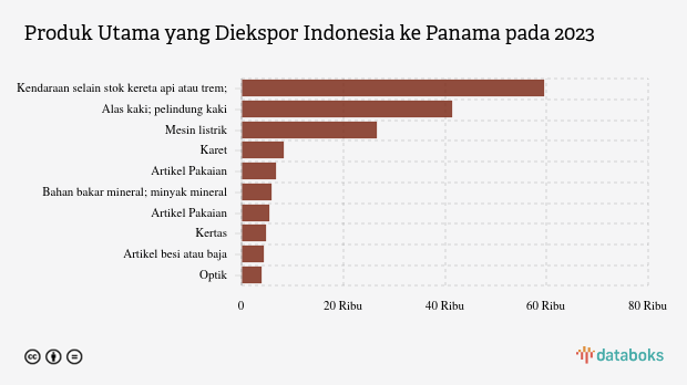 Di urutan kedua, ekspor Indonesia paling banyak adalah produk Alas kaki, pelindung kaki dan sejenisnya. Nilai ekspor dari Panama pada 2023 tercatat US$ 41,52 juta. Angka ini lebih rendah dibandingkan periode sebelumnya yang mampu menembus US$ 49.953 ribu.