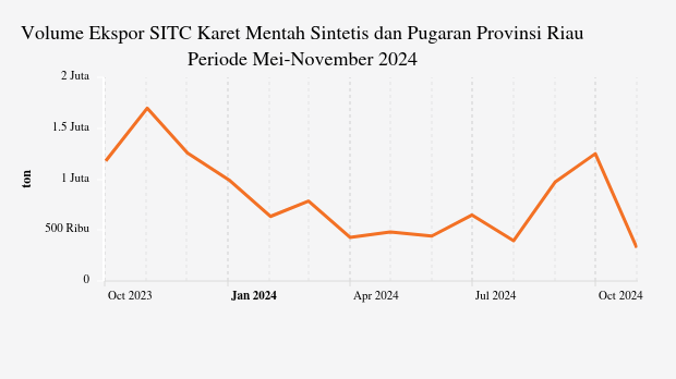 Provinsi Riau pada November 2024 mencatatkan volume ekspor total sebesar 2,08 juta ton. Sedangkan untuk ekspor menurut kelompok barang kode SITC (Standard International Trade Classification) 23 karet mentah, sintetis dan pugaran, provinsi ini pada November 2024 mencatatkan volume yang turun menjadi 327,6 ribu ton.