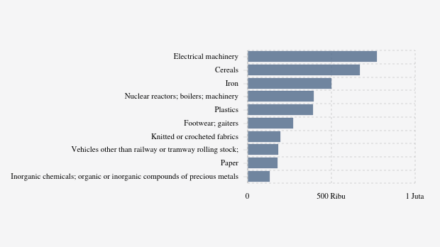 Berikut ini adalah daftar lima produk utama yang diimpor Indonesia dari Vietnam. Urutan ini disusun mulai dari transaksi dengan nilai yang terbesar.