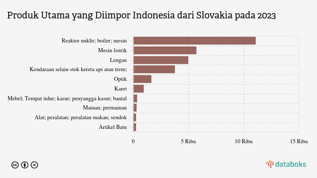 Di urutan kedua, impor Indonesia paling banyak adalah produk Mesin dan peralatan dan bagian listrik. Nilai impor dari Slovakia pada 2023 tercatat US$ 5,71 juta. Angka ini naik dibandingkan periode sebelumnya yang tercatat US$ 4.787 ribu.