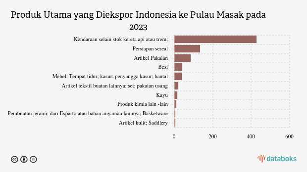 Dari total 97 produk (kode HS dua digit) yang diekspor ke Pulau Masak, 35 produk bernilai lebih dari satu miliar dolar. Selain itu menurut data Trademap, ke negara ini terdapat 22 produk utama Indonesia yang diekspor setiap tahun. Dengan kata lain, produk-produk tersebut merupakan andalan ekspor Indonesia ke Pulau Masak. Lainnya, sebagian besar produk merupakan ekspor produk yang juga banyak diekspor ke negara lain.