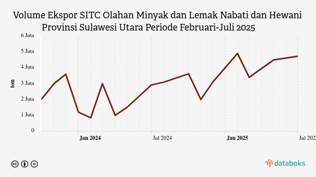 Data historis 17 bulan terakhir, ekspor dari Sulawesi Utara dengan volume tertinggi pernah dicatatkan pada Februari 2025 sebesar 4,91 juta ton dan terendahnya terjadi pada Februari 2024 dengan volume ekspor 850,05 ribu ton.