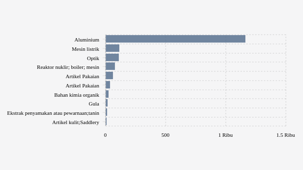Aluminium dan artikelnya dalam klasifikasi Trademap masuk kategori produk HS dengan kode 76. Impor produk ini dari Georgia berada di urutan pertama. Dari negara ini, Indonesia mengimpor senilai US$ 1.161 ribu. Pada tahun sebelumnya Indonesia tidak mencatat adanya impor dari negara ini.