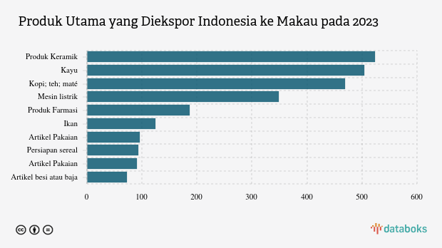 Produk Keramik dalam kategori produk dengan kode HS 69. Ekspor produk ini ke Makau berada di urutan pertama. Indonesia mengekspor senilai US$ 0,52 juta. Nilai ekspor Produk Keramik ini naik dibandingkan periode sebelumnya yang tercatat US$ 456 ribu.