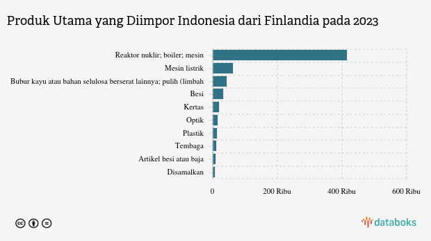 Masuk dalam kode HS 84, Reaktor nuklir, boiler, mesin dan peralatan mekanis merupakan kelompok produk barang impor yang dikategorikan bersama dengan Bagian. Impor produk ini dari Finlandia berada di urutan pertama. Indonesia mengimpor sebanyak US$ 415,95 juta. Nilai impor Reaktor nuklir, boiler, mesin dan peralatan mekanis; Bagian ini naik dibandingkan periode sebelumnya yang tercatat US$ 314,49 juta.