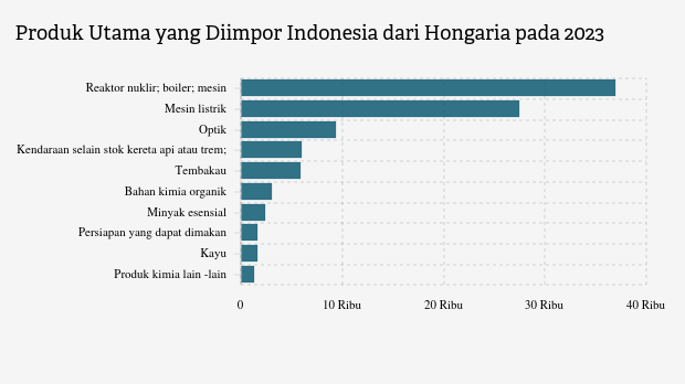 Di urutan kedua, impor Indonesia paling banyak adalah produk Mesin dan peralatan dan bagian listrik. Nilai impor dari Hongaria pada 2023 tercatat US$ 27,47 juta. Angka ini lebih rendah dibandingkan periode sebelumnya yang mampu menembus US$ 41.130 ribu.