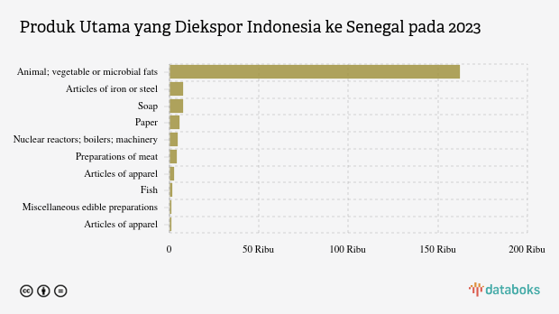 Di urutan kedua, ekspor Indonesia paling banyak adalah produk iron or steel. Nilai ekspor dari Senegal pada 2023 tercatat US$ 7,72 juta. Angka ini naik dibandingkan periode sebelumnya yang tercatat US$ 106 ribu.