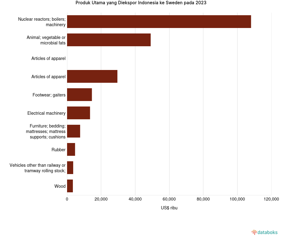 Masuk dalam kode HS 84, Nuclear reactors, boilers, machinery and mechanical appliances merupakan kelompok produk barang ekspor yang dikategorikan bersama dengan parts. Ekspor produk ini ke Sweden berada di urutan pertama. Dari negara ini, Indonesia mengekspor senilai US$ 108,09 juta. Nilai ekspor Nuclear reactors, boilers, machinery and mechanical appliances; parts ini naik dibandingkan periode sebelumnya yang tercatat US$ 3.270 ribu.