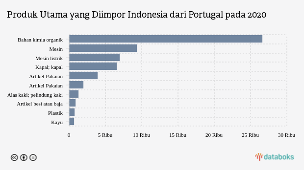 Bahan kimia organik dalam klasifikasi Trademap masuk kategori produk HS dengan kode 29. Impor produk ini dari Portugal berada di urutan pertama. Dari negara ini, Indonesia mengimpor senilai US$ 26.589 ribu. Nilai impor Bahan kimia organik ini naik dibandingkan periode sebelumnya yang tercatat US$ 9 ribu.