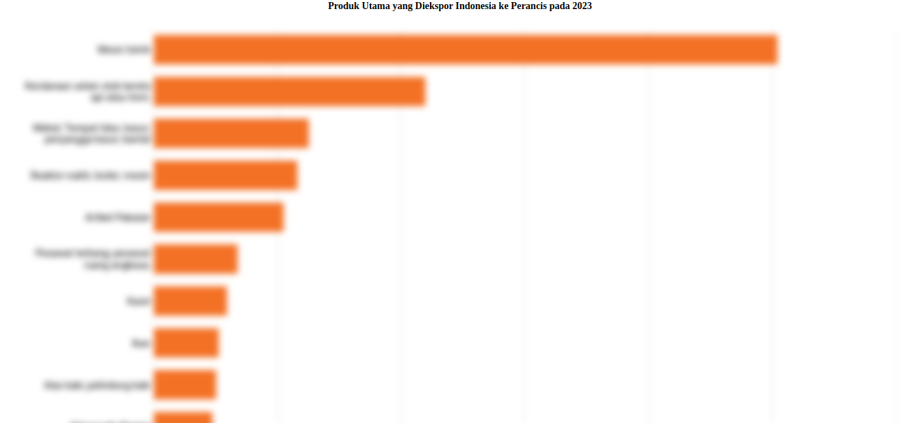 Berikut ini adalah daftar lima produk utama yang diekspor Indonesia ke Perancis. Urutan ini disusun mulai dari transaksi dengan nilai yang terbesar.