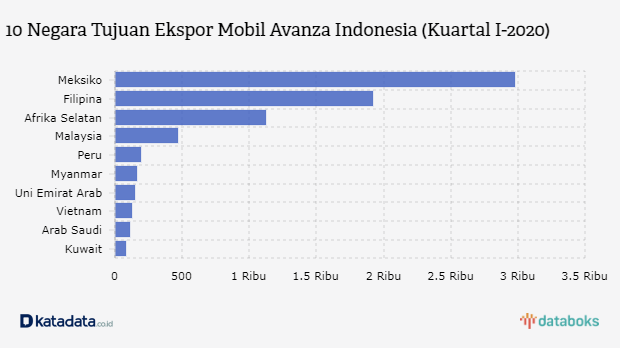Indonesia mengekspor 7.493 unit mobil Avanza secara utuh atau Completely Build Up (CBU) sepanjang kuartal I-2020. Dari jumlah tersebut, hampir 40% dikirim ke Meksiko, atau sebanyak 2.980 unit. Kemudian, ke Fipilina dan Afrika Selatan di kisaran seribu unit.