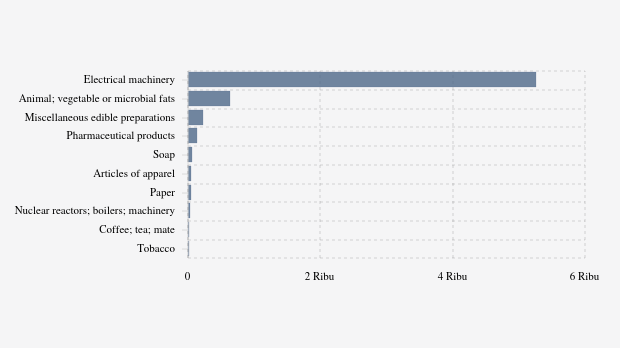 Di urutan pertama, Indonesia banyak mengekspor Electrical machinery and equipment and parts. Dalam klasifikasi tradmap, Electrical machinery and equipment and parts masuk kategori produk HS dengan kode 85. Produk ini merupakan jenis barang ekspor yang dikelompokkan bersama dengan sound recorders and reproducers, television
