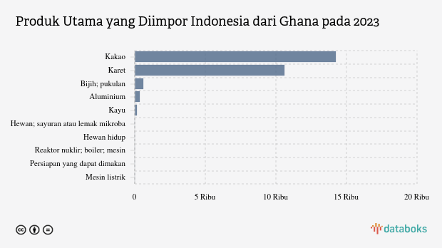 Dari total 97 produk (kode HS dua digit) yang diimpor dari Ghana, 40 produk bernilai lebih dari satu miliar dolar. Selain itu menurut data Trademap, dari negara ini terdapat 12 produk utama Indonesia yang diimpor setiap tahun. Artinya, ada ketergantungan cukup besar untuk produk-produk impor tersebut. Lainnya, sebagian besar produk merupakan impor produk yang juga banyak diimpor dari negara lain.