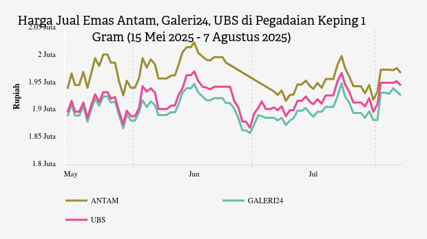 Harga Jual Emas Antam, Galeri24, UBS di Pegadaian Keping 1 Gram (15 Mei 2025 - 7 Agustus 2025)
