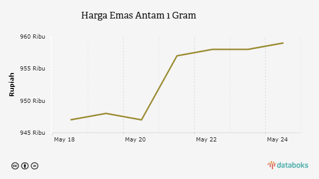 Harga logam mulia (emas) PT Aneka Tambang Tbk turun Rp 4.000 per gram menjadi Rp 955.000 per gram pada Selasa, 25 Mei 2021. Harga jual juga turun Rp 4.000 per gram menjadi Rp 865.000 per gram.