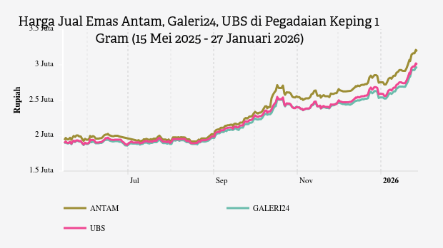 Harga Jual Emas Antam, Galeri24, UBS di Pegadaian Keping 1 Gram (15 Mei 2025 - 27 Januari 2026)
