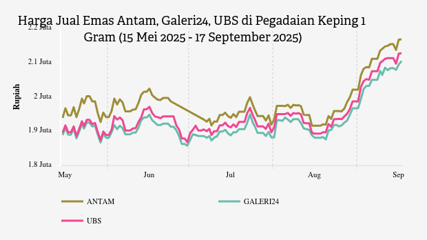 Harga Jual Emas Antam, Galeri24, UBS di Pegadaian Keping 1 Gram (15 Mei 2025 - 17 September 2025)