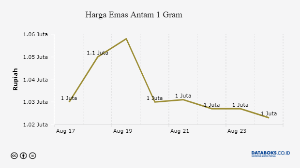 Harga logam mulia (emas) PT Aneka Tambang Tbk pada Senin, (24/8) turun Rp 4.000 per gram menjadi Rp 1.023.000 per gram. Sementara harga jual kembali (buyback) turun Rp 6.000 per gram menjadi seharga Rp 919.000 per gram.