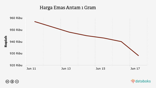 Harga emas (logam mulia) PT Aneka Tambang Tbk turun Rp 8.000 menjadi Rp 920.000 per gram pada Jumat, 18 Juni 2021. Harga jual kembali (buyback) juga menurun Rp 11.000 ke level Rp 822.000 per gram.