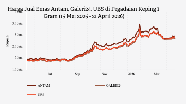 Harga Jual Emas Antam, Galeri24, UBS di Pegadaian Keping 1 Gram (15 Mei 2025 - 21 April 2026)