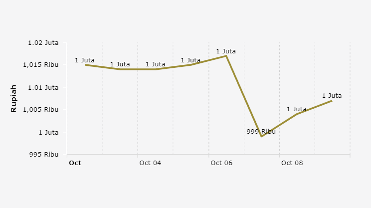 Logam mulia (emas) PT Aneka Tambang Tbk pada Jumat, (9/10) naik Rp 3.000 per gram menjadi seharga Rp 1.007.000 per gram. Sementara harga jual kembali juga naik Rp 4.000 per gram menjadi seharga Rp 898.000 per gram.