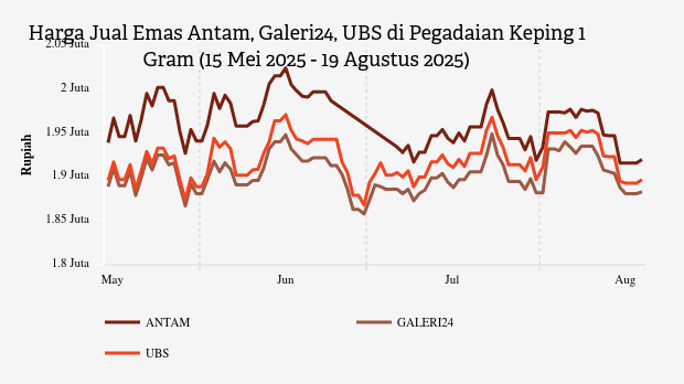 Harga Jual Emas Antam, Galeri24, UBS di Pegadaian Keping 1 Gram (15 Mei 2025 - 19 Agustus 2025)