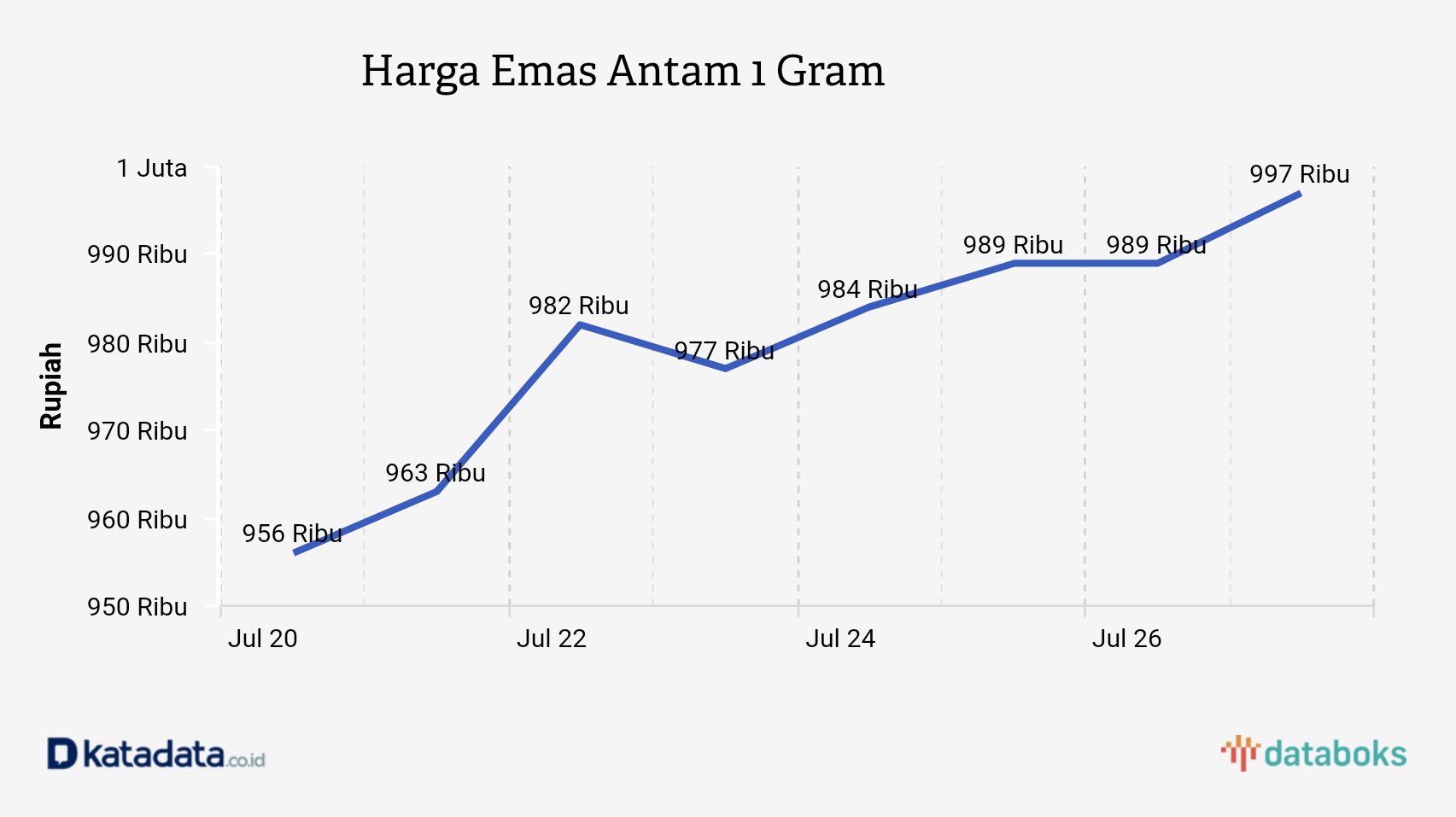 Harga emas (logam mulia) PT Aneka Tambang Tbk pada Senin, (27/7) naik Rp 8.000 per gram menjadi Rp 997.000 per gram. Sementara harga jual kembali (buyback) naik Rp 7.000 per gram menjadi Rp 896.000 per gram.