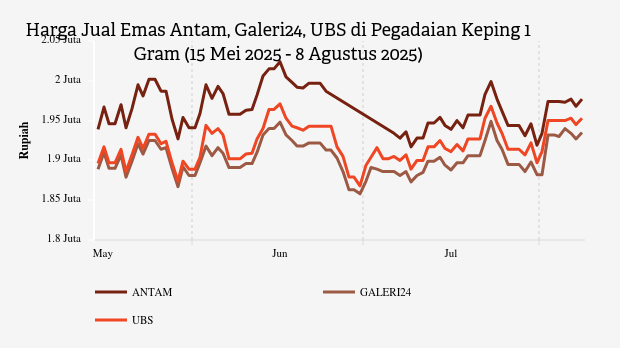 Harga Jual Emas Antam, Galeri24, UBS di Pegadaian Keping 1 Gram (15 Mei 2025 - 8 Agustus 2025)