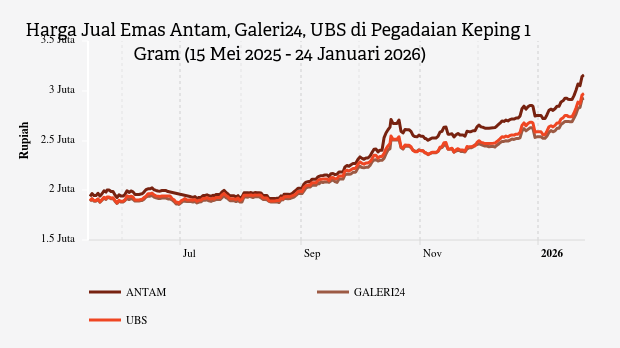 Logam mulia (emas) PT Aneka Tambang Tbk pada Senin, (10/8) turun Rp 1.000 per gram menjadi seharga Rp 1.054.000 per gram.
