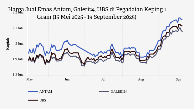 Harga Jual Emas Antam, Galeri24, UBS di Pegadaian Keping 1 Gram (15 Mei 2025 - 19 September 2025)
