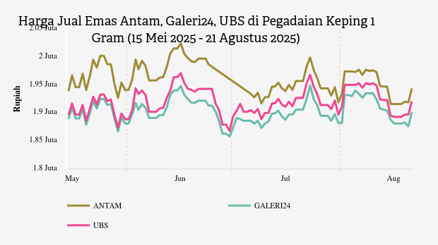 Harga Jual Emas Antam, Galeri24, UBS di Pegadaian Keping 1 Gram (15 Mei 2025 - 21 Agustus 2025)