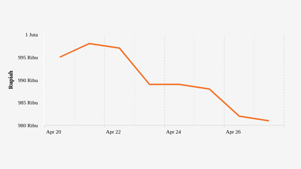 Harga emas Antam pada Rabu, 27 April 2022 turun Rp 1000 menjadi Rp 981.000 per gram, atau turun 0,1 persen dibandingkan hari sebelumnya. Sementara untuk harga jual kembali (buyback) sebesar Rp 885 ribu per gram.