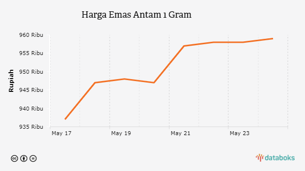 Harga logam mulia (emas) PT Aneka Tambang Tbk naik Rp 1.000 per gram menjadi Rp 959.000 per gram pada Senin, 24 Mei 2021. Harga jual juga naik Rp 1.000 per gram menjadi Rp 869.000 per gram.