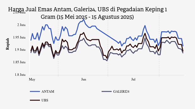Harga Jual Emas Antam, Galeri24, UBS di Pegadaian Keping 1 Gram (15 Mei 2025 - 15 Agustus 2025)