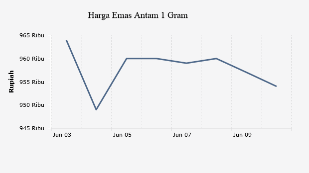 Harga logam mulia (emas) PT Aneka Tambang Tbk turun Rp 3.000 per gram menjadi Rp 954.000 per gram pada Kamis, 10 Juni 2021. Harga jual juga turun Rp 3.000 per gram menjadi Rp 865.000 per gram.