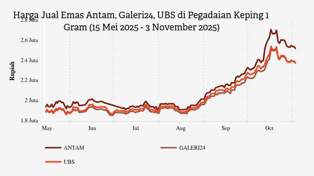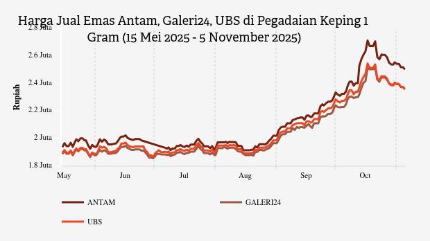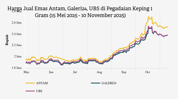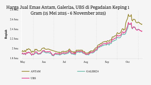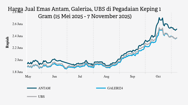 Harga Jual Emas Antam, Galeri24, UBS di Pegadaian Keping 1 Gram (15 Mei 2025 - 11 November 2025)
