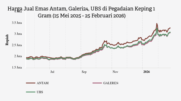 Harga Jual Emas Antam, Galeri24, UBS di Pegadaian Keping 1 Gram (15 Mei 2025 - 25 Februari 2026)