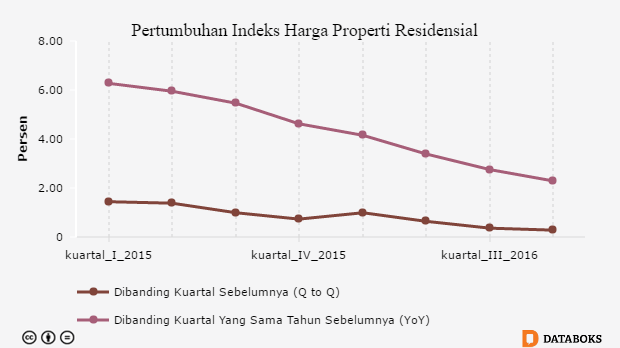 Survei Harga Properti Residensial (SHPR) Bank Indonesia triwulan III-2015 mengindikasikan adanya perlambatan pertumbuhan harga properti residensial di pasar primer. Hal ini tercermin dari Indeks Harga Properti Residensial pada triwulan III-2015 yang tumbuh sebesar 0,99% (qtq) atau 5,46% (yoy), lebih rendah dibandingkan dengan pertumbuhan triwulan sebelumnya yang tercatat 1,38% (qtq) atau 5,95% (yoy).