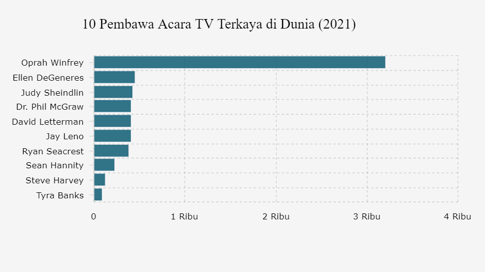 Melansir dari wealthygorilla.com, Oprah Winfrey menempati urutan pertama sebagai pembawa acara televisi terkaya di dunia saat ini dengan kekayaan sebesar US$ 3,2 miliar (Rp 45,8 triliun). Dengan kekayaannya, Oprah berhasil membangun kerajaan media dan memiliki acaranya sendiri, yaitu OWN.