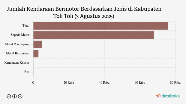 Jumlah kendaraan bermotor di Toli Toli mencapai 75,61 ribu unit pada Agustus 2025, didominasi sepeda motor (67,83 ribu). Data ini berasal dari ERI Korlantas Polri.