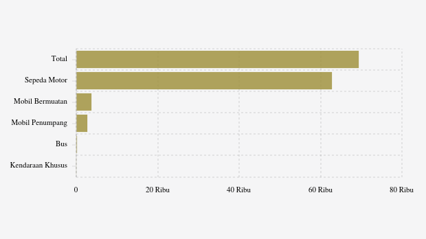 Total kendaraan bermotor di Kab. Dompu mencapai 69,38 ribu unit per Juli 2025. Sepeda motor dominan (62,76 ribu unit), diikuti mobil bermuatan, mobil penumpang, bus, dan kendaraan khusus. Data dari ER
