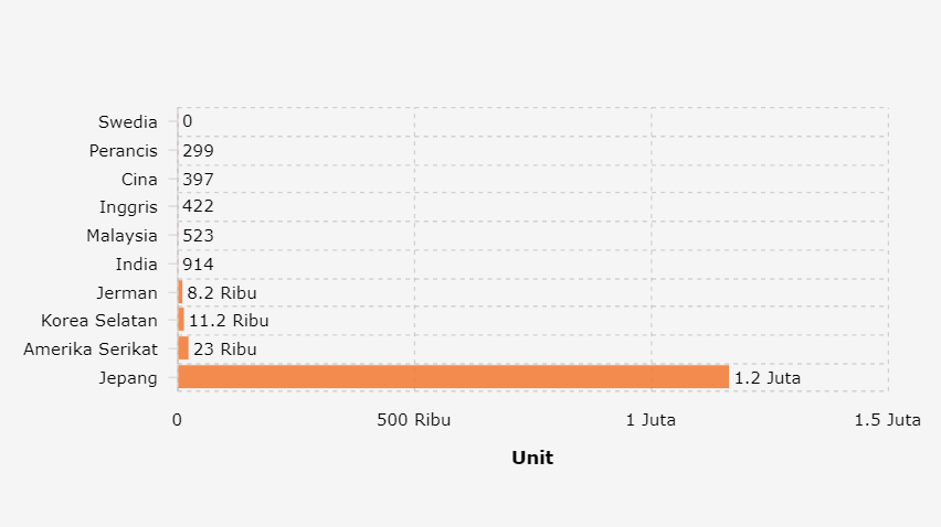 Diposisi kedua mobil dengan merek asal Amerika tercatat 1,91 persen (23.034 unit) dan diposisi ketiga mobil dengan merek asal Korea Selatan tercatat 0,93 persen (11.223 unit). Diposisi keempat mobil dengan merek asal Jerman tercatat 0,68 persen (8.206 unit), kemudian diposisi kelima mobil merek asal India tercatat 0,08 (914 unit).