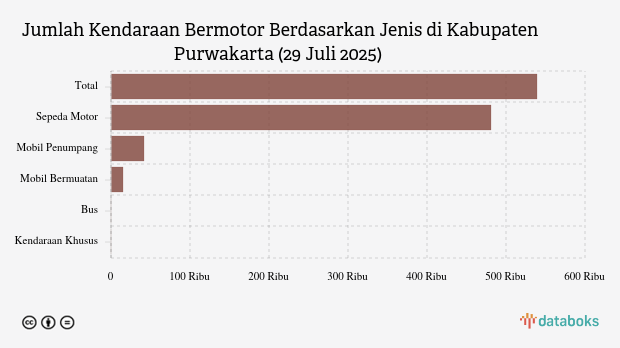 Total kendaraan bermotor di Purwakarta Juli 2025 mencapai 538,72 ribu unit, didominasi sepeda motor (481,16 ribu). Data dari ERI Korlantas Polri.