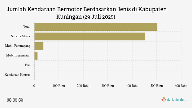 Kab. Kuningan memiliki 503,1 ribu kendaraan bermotor per Juli 2025, didominasi sepeda motor (453,09 ribu). Data Korlantas Polri merinci jenis kendaraan di Kuningan.
