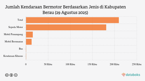 Jumlah kendaraan bermotor di Kabupaten Berau mencapai 209,63 ribu unit pada Agustus 2025, didominasi sepeda motor (181,08 ribu unit), berdasarkan data ERI Korlantas Polri.