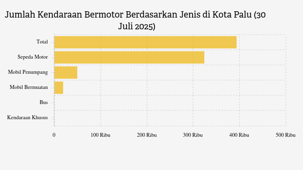 Total kendaraan bermotor di Palu capai 393,44 ribu unit Juli 2025 (data ERI Korlantas Polri). Sepeda motor mendominasi dengan 323,43 ribu unit, diikuti mobil penumpang & mobil barang.